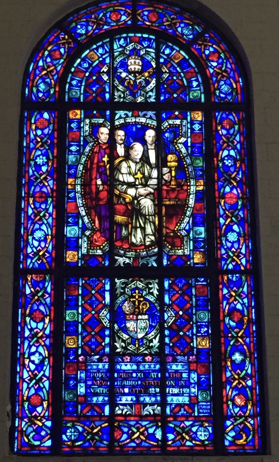 There is little explanation why this distinctive window exists and nothing at all on the church’s web site. One clue however might be that the present church was completed and dedicated in 1931. The first Vatican radio broadcast was the same year, Feb. 12, 1931. (Perhaps, and this is just a theory, the window was some rich parishioner’s commemoration to honor the then new-age church.)
