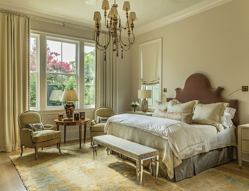 Throughout the home, Graci incorporated existing antique pieces, reupholstering and altering them to fit the new design scheme. The result is a cohesive blend of old and new, tradition and innovation. Textiles play a crucial role in the home’s design. A damask in the living room is an overscaled version of a very old rural fabric, while a Scalamandre leopard print adds va-va-voom to traditional chairs in one of the bedrooms. In the entry hall, a work by New Orleans-based artist Raine Bedsole hangs over the antique Swedish clock. “They needed something modern, a little unexpected, because everything in that room was getting very, very traditional,” says Graci.