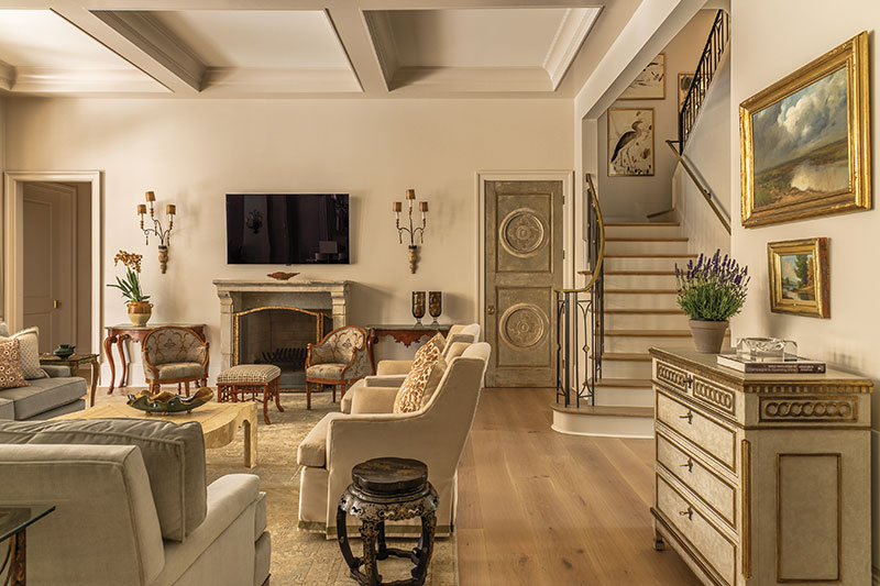 The family room, also known as the garden room, provides a cozy gathering space. Graci installed an 18th-century limestone fireplace mantle, which he sourced and had reassembled to give the room “some gravitas.” Swivel chairs refreshed with new skirts and trim offer comfortable seating, while Lucite legs on the coffee table add a contemporary touch. Centrally located, the homeowner says the garden room is a favorite gathering space for the family.