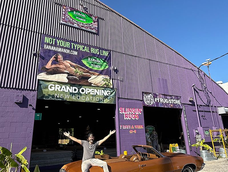 Voted the #1 Rug Store in New Orleans by Gambit, New Orleans Home & Inside New Orleans, and named a Top 25 Retail Star in the US by Home Accents Today, it appears McKearn’s decision to make “Ridiculous” a core component of the Banana Manor brand was the right move. So his billboards parodying the infamous Burt Reynolds Cosmo centerfold come as no surprise. Nor does the lineup of free adult beverages, the outdoor entertainment areas with a swimming pool, and the Rug Bar, where almost every rug can be ordered in any size, shape & colorway.