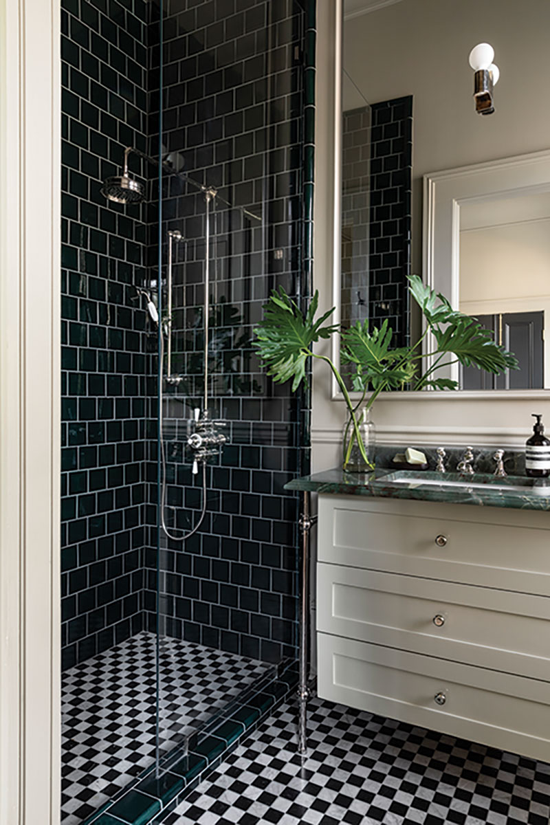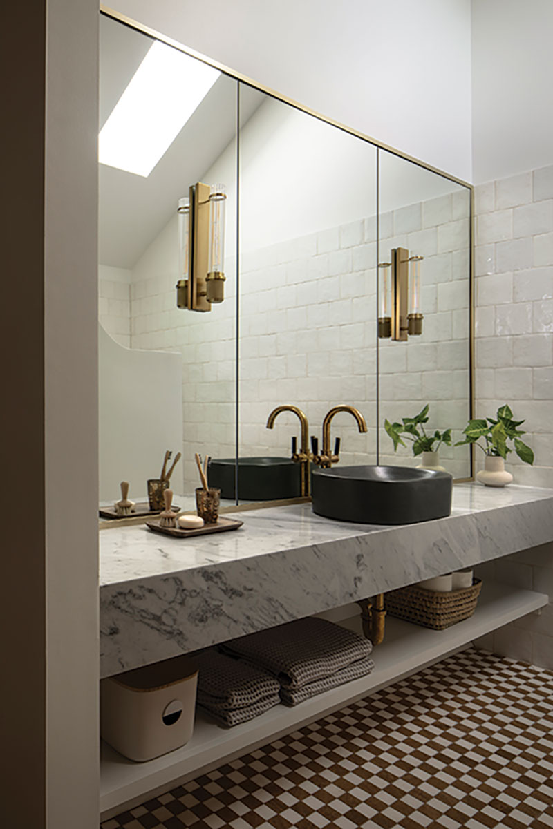 One element Jayson felt particularly passionate about was checkerboard tile. What began as a simple black-and-white scheme evolved at the stone yard when exotic slabs — Alexandrita quartzite and Cristallo Jadore quartzite — inspired a bolder approach. The team selected checkerboard tiles in three colorways, creating uniquely saturated bathrooms that pushed conventional boundaries.