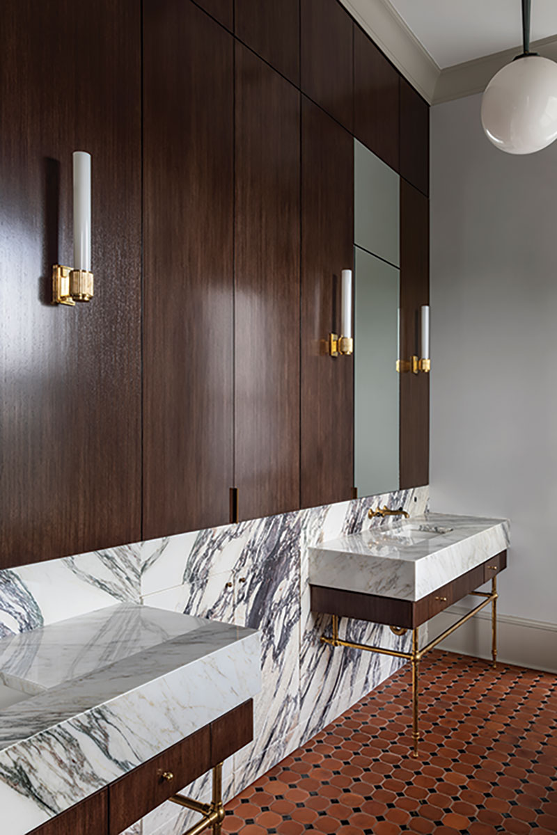 The renovation centered on restoring the home’s original flow and grandeur. For example, a switchback stair at the front door had awkwardly served both the main residence and apartment. “The flow of the house was very choppy before we made changes,” Allen says. “Once we decided to recapture the apartment space into the main residence, we knew the stair had to be reworked — its configuration didn’t make sense for a single-family home. The entry, stair and center hall set the tone for the overall organization of the house, so restoring that sense of hierarchy became [paramount].”