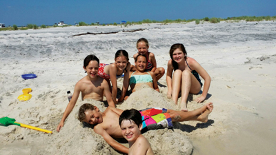 Once we arrived at the pier on Ship Island, we grabbed our gear and headed to the beach. Storage space on the ferry vessel is limited, so it’s helpful to pack light, but soft-sided coolers and collapsible chairs in canvas carrying bags are allowed. You will also want to make sure you have snacks, drinks and of course a lot of sunscreen. Our gang set up on the south side, the Gulf of Mexico side, of the island. Chairs and umbrellas are available for rent in the peak summer season. In no time, the kids were swimming in the Gulf, hiking around the interior marshes and playing on the beach.