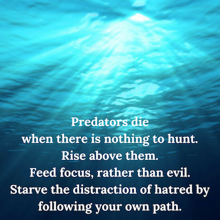 What of rogue sharks? They pack a big bite and demand grit. However, predators die when they have nothing to hunt. We can rise above. We can feed focus, rather than evil, and starve the distraction of hatred by following our own paths.