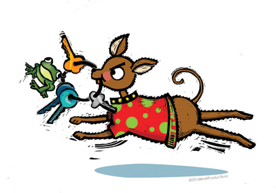 It ain’t easy trying five keys in the door with a growling chihuahua under one arm. When I finally get in, Chopsley snaps the key ring out my hand and zips under the couch. He wants to kill that frog.